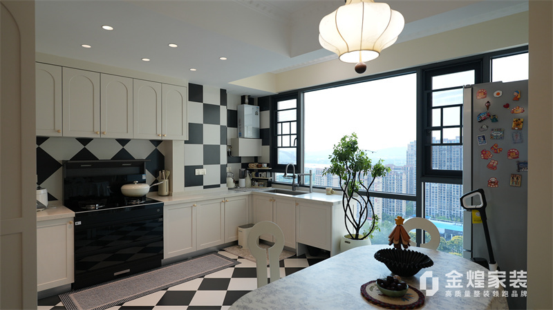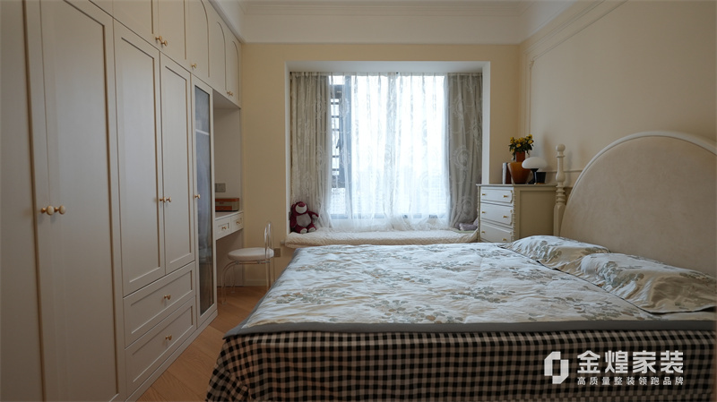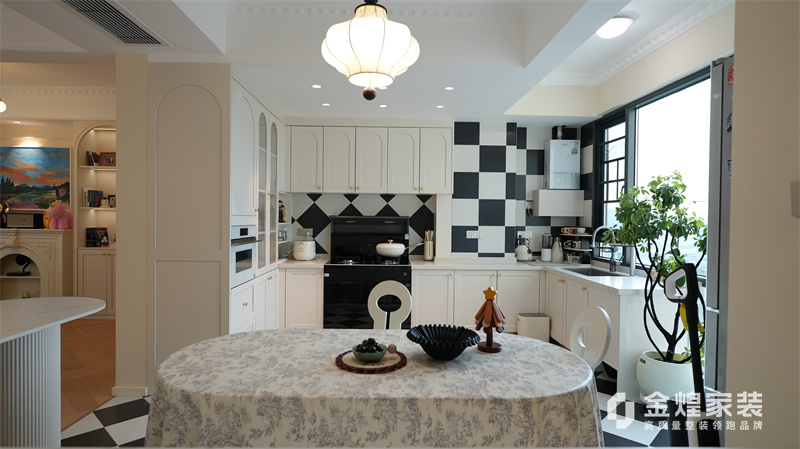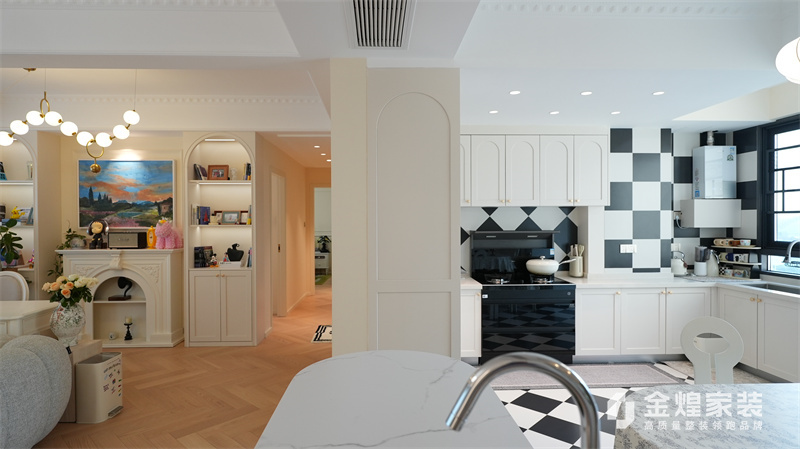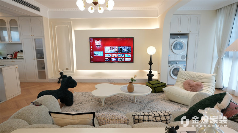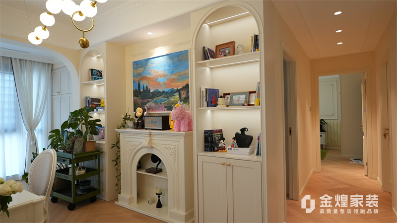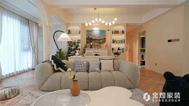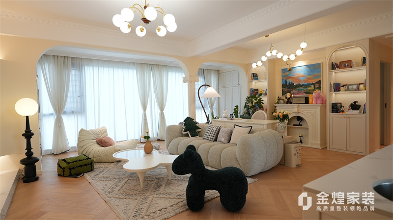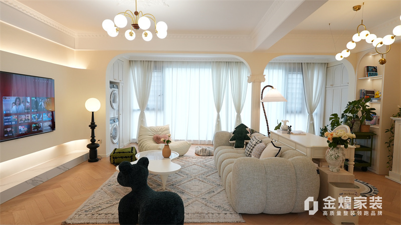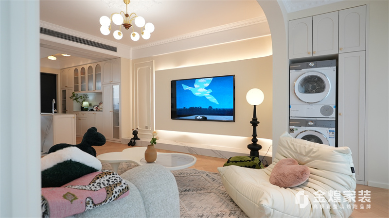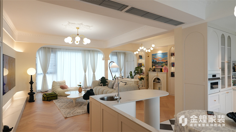 該案例整體色調柔和淡雅,家具造型簡約,線條流暢,同時融入了一些法式元素,如精致的吊燈、優雅的拱形門洞和浪漫的裝飾細節,既保留了法式風格的浪漫與優雅,又兼具現代簡約的簡潔與實用。