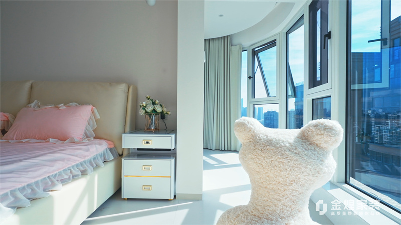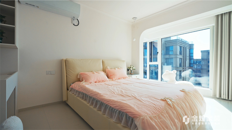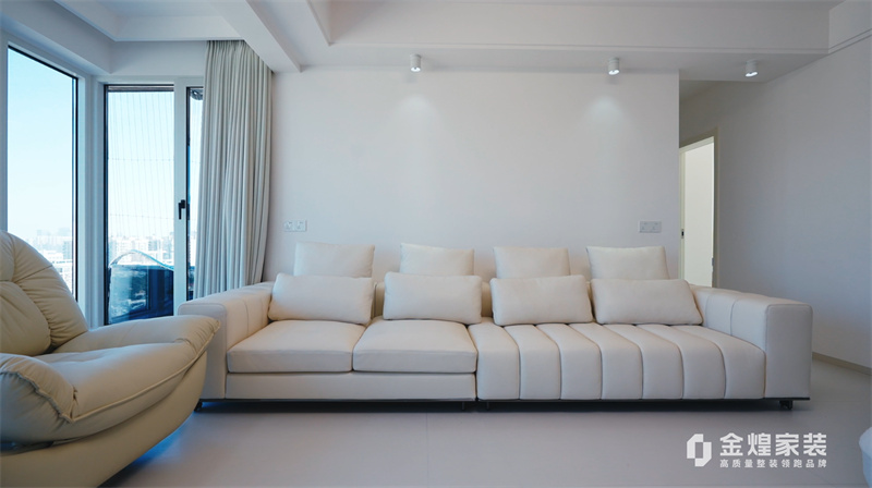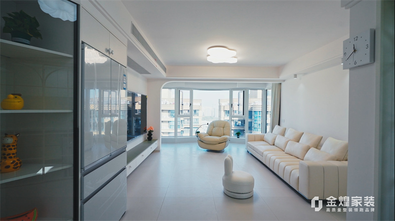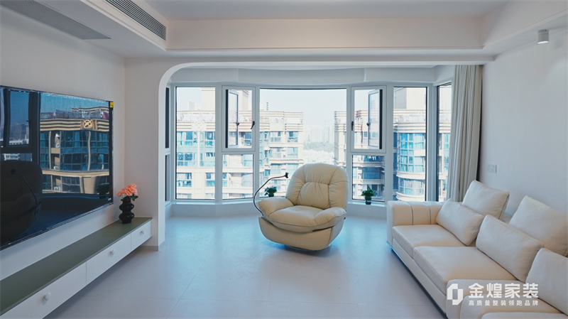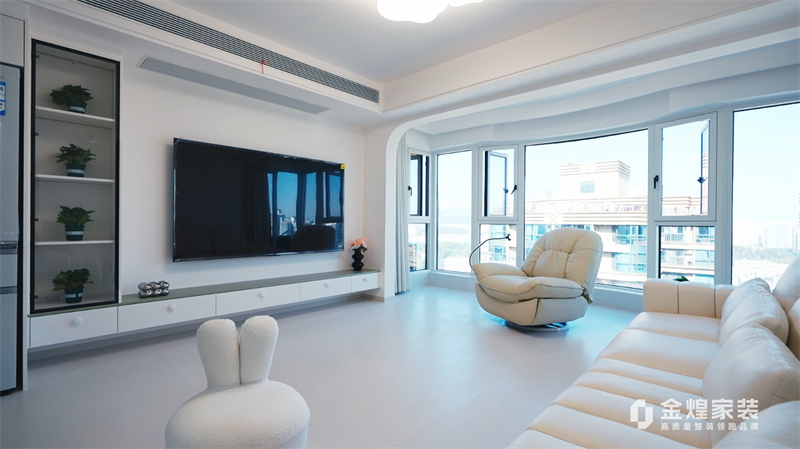 客廳內(nèi),大電視直接掛在墻上,下方配以簡約的電視柜,旁邊擺放著舒適的沙發(fā)和別致的休閑椅,沒有過多的繁雜裝飾,顯得寬敞又明亮。大窗戶的設(shè)計讓室內(nèi)光線充足,進一步增強了空間的通透感。