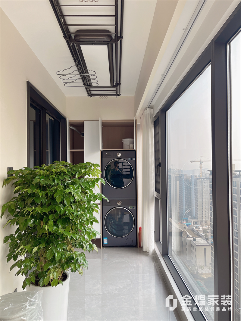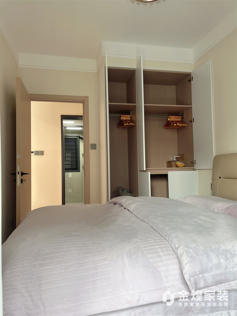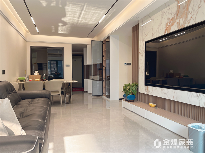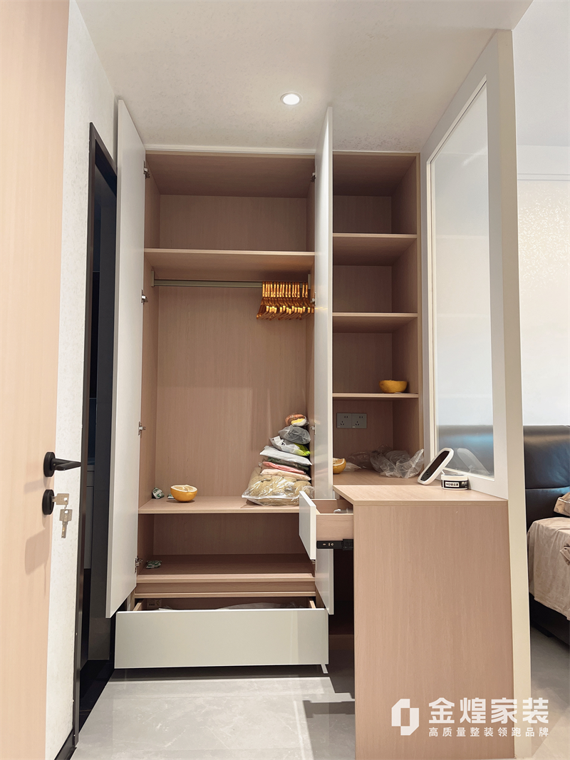 入戶門往電梯間推出去了1m,增加了過道面積跟儲物空間。整體色調偏暖色,家具選用深色家具讓空間更有層次。