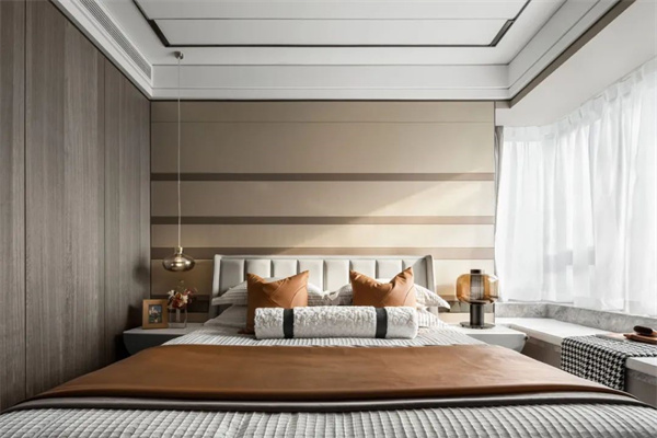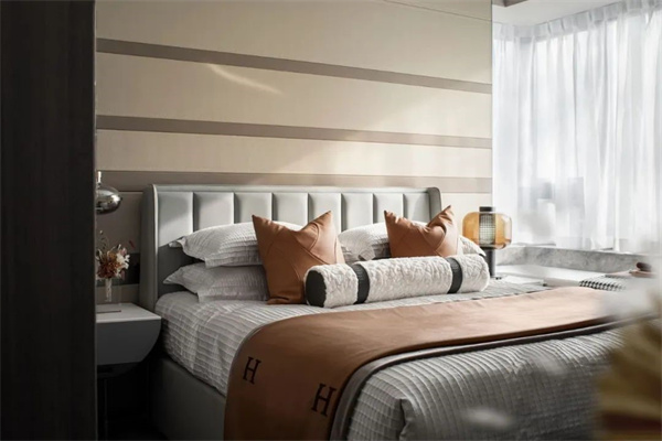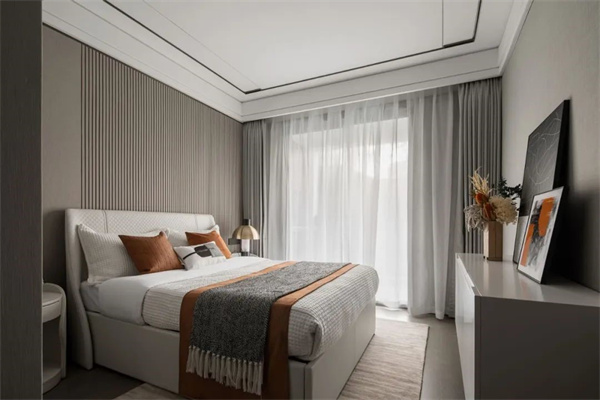 主臥色調以柔和的灰白為主,帶來寧靜而舒適的氛圍。床頭靠背采用暖色的軟包設計,簡潔卻極具質感,與木色邊柜形成和諧的對比。超大窗戶帶來卓越的自然采光條件,同時擴大了空間的視覺效果,為房間注入更多的明亮和開闊感。