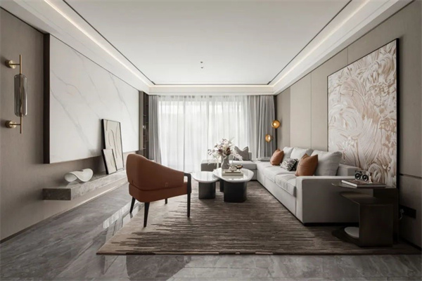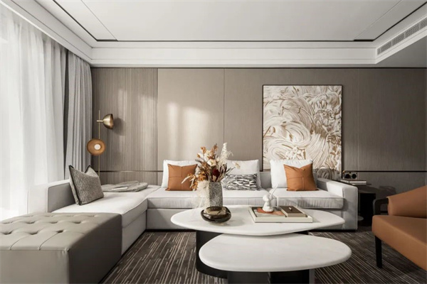在客廳的設計中,采用簡約的家具和裝飾品,搭配簡約風格的藝術裝飾和照明燈具,選擇中性色調和柔和的色彩搭配,營造出輕松宜人的氛圍。同時,充分利用空間,確保流線型布局,使客廳顯得更加開闊和通透。
