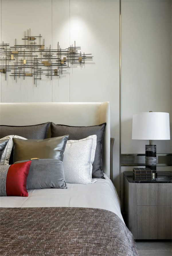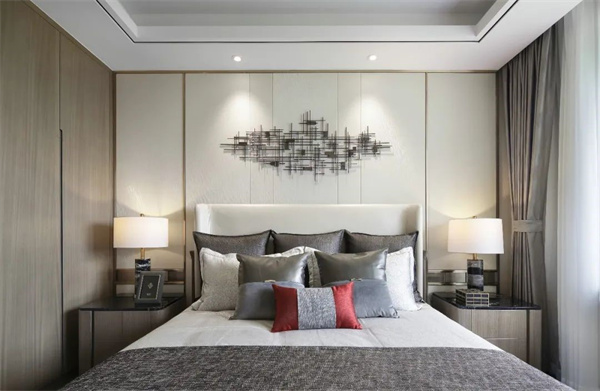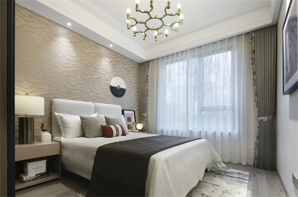 傳統的中式元素與現代的簡約設計完美結合,呈現出典雅與舒適的空間氛圍。床頭背景設計了一幅大型藝術背景裝飾,為整個房間增添了一份藝術氣息。大窗戶讓自然光線充盈房間,這樣的主臥空間,不僅是休憩的港灣,更是文化與現代生活的完美融合。