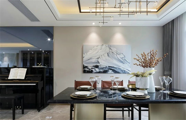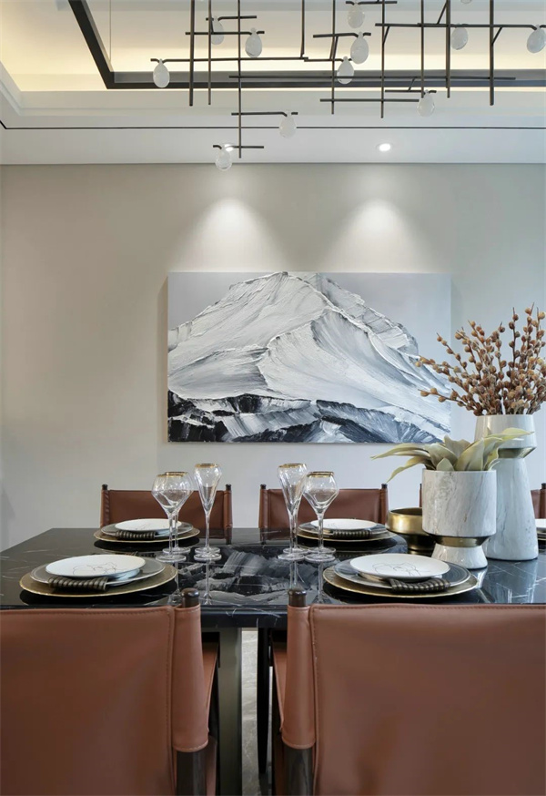 餐廳的餐桌椅采用深色調,融合傳統工藝與現代簡約線條,獨具匠心。餐桌中央擺放著玻璃花瓶,里面插著新鮮的花卉,為餐廳增添了一份生機與色彩。頂部懸掛著精美吊燈,柔和的燈光灑在餐桌上,營造出溫馨的用餐氛圍。