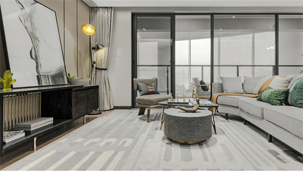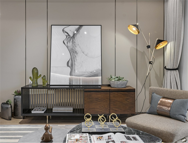 本案采用灰白中性色搭配原木地板為主色調,營造清新簡約的空間氛圍。室內家具選用了簡約設計的灰白色系,搭配金屬材質的細節裝飾與綠植,使整體空間更顯現代感和奢華感。