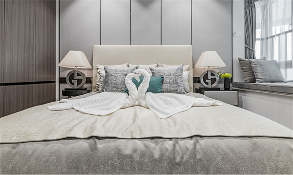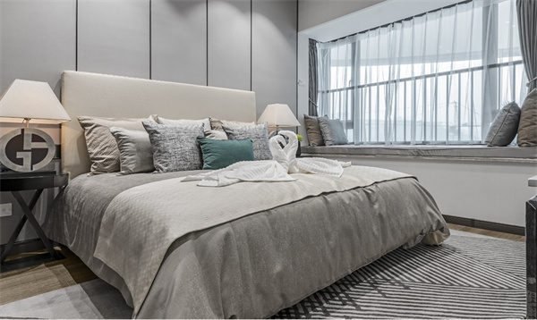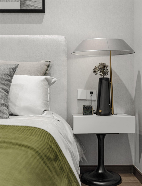 臥室精心挑選了高品質的床具,搭配柔軟舒適的床品和軟裝,柔和舒緩的色調給人帶來寧靜。保證睡眠質量同時,考慮到大空間的照明需求,臥室布置的燈具都以溫柔的意象為主題,為空間營造了貼心的守護感。