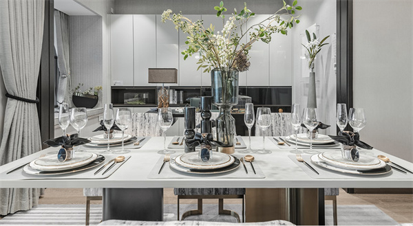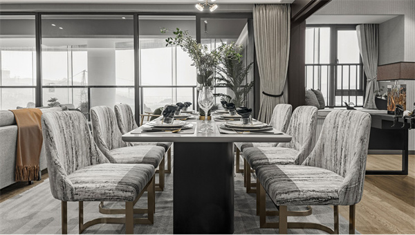 餐廳延續客廳的風格,將定制柜的美觀與實用性發揮得淋漓盡致。現代感十足的燈具將溫暖的光線投射到大理石餐桌和布藝餐椅上,營造出舒適的用餐氛圍。開闊的陽臺風格和清新的綠植為餐廳增添自然美景,讓美食與美景的享受在此刻達到巔峰。