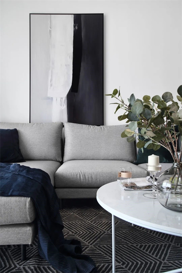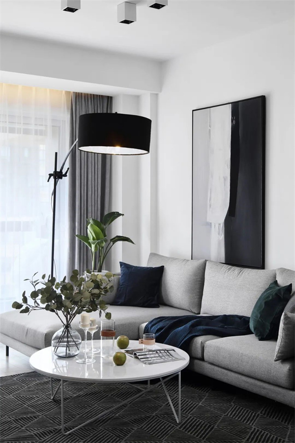 客廳空間巧妙運用了明亮的白色墻壁和原木色地板,賦予整個室內以寬敞和開放的感覺。家具選擇了精妙的極簡設計,包括低調的沙發,簡約的咖啡桌和現代風格的裝飾組合。