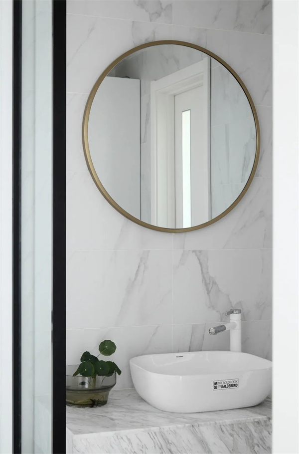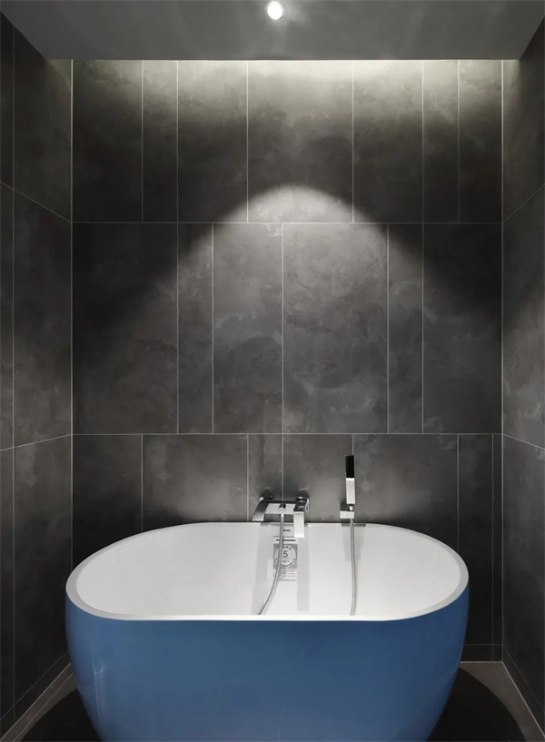 衛生間的洗手臺設計簡約,搭配定制儲物柜,采用中性色調,為業主提供收納空間的同時維持整潔。浴缸采用獨立式設計,周圍點綴著灰色瓷磚,強調了空間的純粹與線條感,完美融合了日常實用性和美學價值。