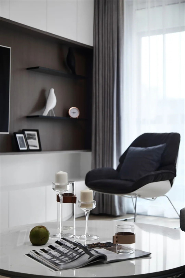空間沒有多余的裝飾,注重簡潔的線條和幾何形狀,打造了一個寧靜而舒適的氛圍。這個設計使得客廳成為一個理想的休憩場所,突顯了空間的純粹美感。