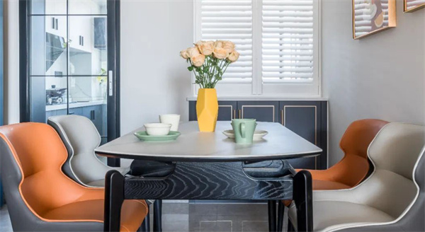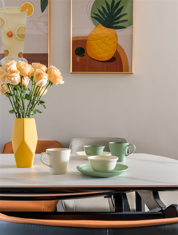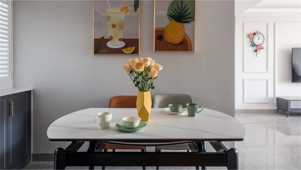 餐廳是家中最浪漫的一隅,承載著三餐四季。裝飾畫(huà)和金屬吊燈搭配,顯得餐廳的設(shè)計(jì)更加有品位有情調(diào)。暖色餐桌椅組合,搭配桌面上的杯碟與花瓶,營(yíng)造出浪漫精致的用餐氛圍。