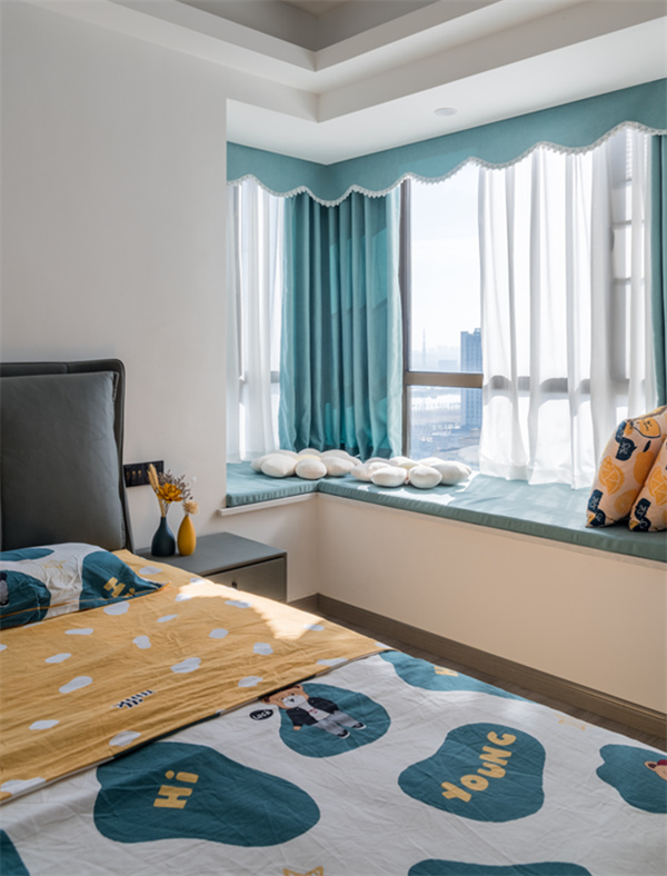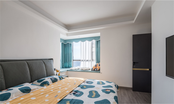 臥室灰色的皮藝床與床頭留白的墻面相輝映,搭配藍(lán)白相間的床品和天藍(lán)色窗簾,整體顯得素雅而又舒適大氣。在飄窗上看看書(shū)/曬曬太陽(yáng)/吸吸貓或者躺著放空睡一覺(jué),也不失為一個(gè)美好的下午。