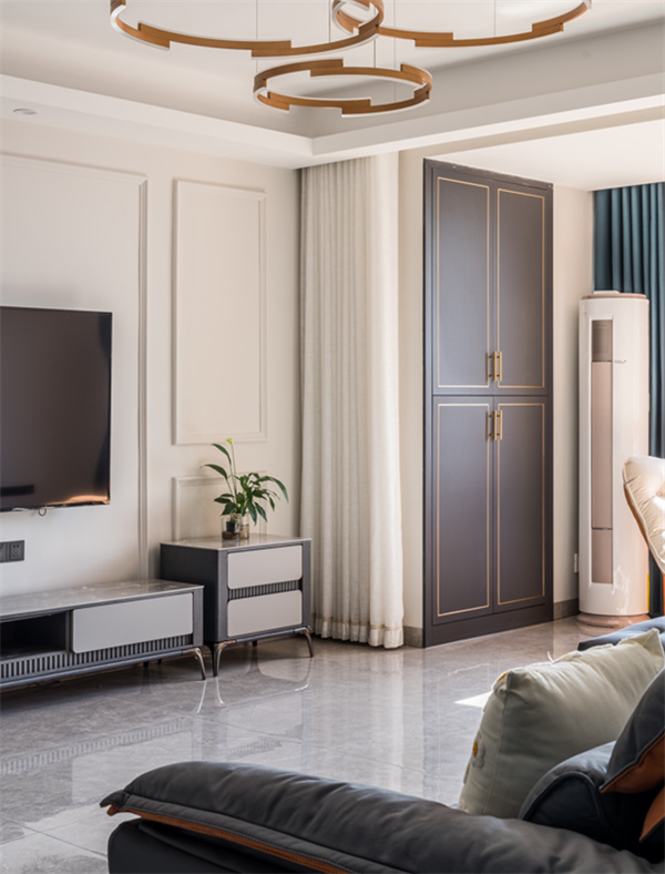 客廳灰色地磚與簡(jiǎn)潔墻面空間結(jié)合,搭配灰色皮藝沙發(fā),而電視墻則是以白色飾面板為背景,壁掛上電視機(jī),呈現(xiàn)出簡(jiǎn)潔大方的格局。陽(yáng)臺(tái)上色彩明亮的窗簾搭配暖色布藝沙發(fā),帶來(lái)的是簡(jiǎn)約的優(yōu)雅空間感,縱享愜意時(shí)光。