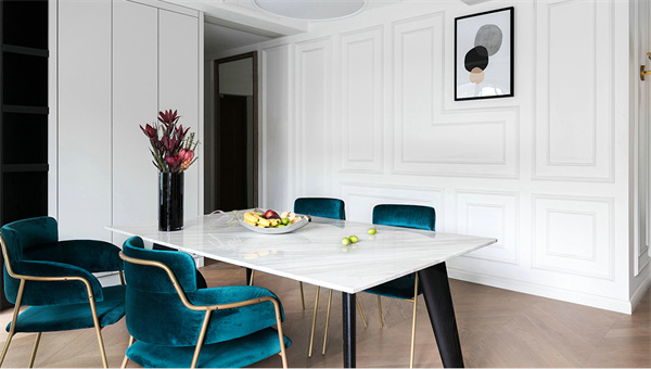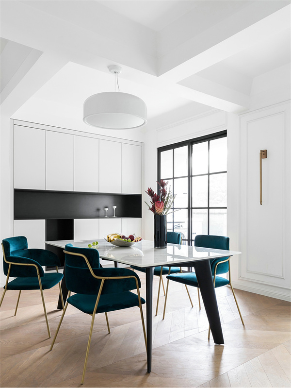 餐廳的椅子選用金屬+布藝搭配,強調(diào)簡約與質(zhì)感。餐具和裝飾品注重線條簡單,營造純凈的用餐環(huán)境。燈光設(shè)計簡潔而柔和,打造出寧靜而舒適的用餐氛圍,突顯生活格調(diào)。