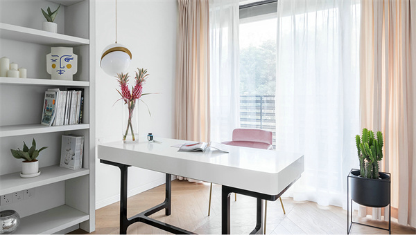 書柜與書桌延續(xù)白色主調(diào),明亮的陽光透過寬大窗戶灑在書桌上,創(chuàng)造了宜人的學習環(huán)境。空間里擺放的綠植增添生機,注入清新氛圍,為業(yè)主營造思考與學習的寧靜空間。