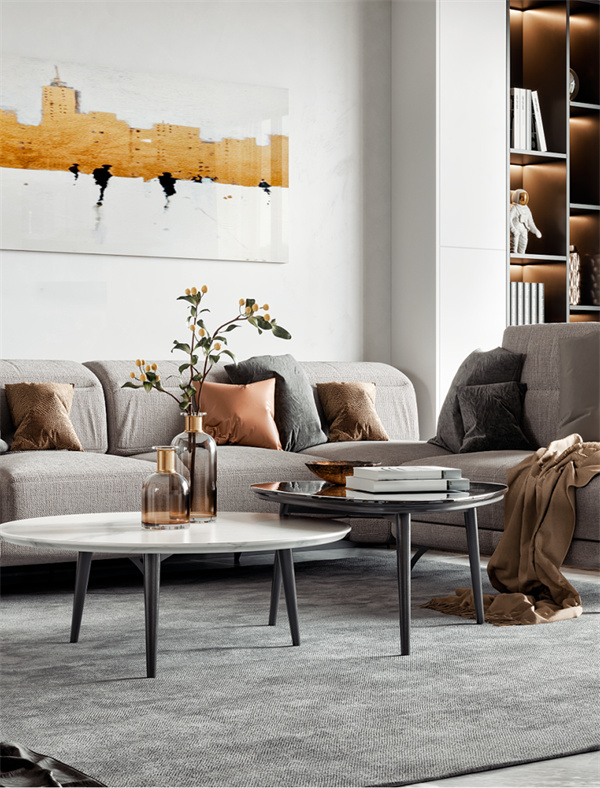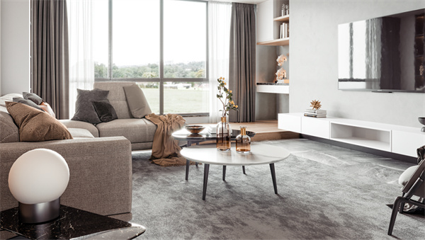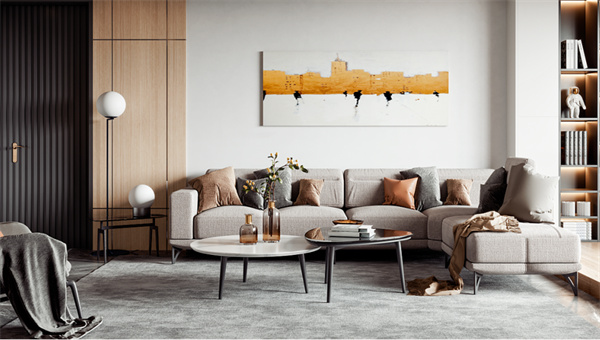 客廳的設計注重舒適和開放感,白色墻壁和中性色調的地板創造了明亮的背景,大窗戶保了足夠的自然光線。舒適的沙發、柔軟的地毯和靠枕提供了宜人的休息空間,墻上掛著一些抽象藝術品,為空間增加現代感。