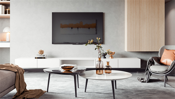 電視背景墻則是以極簡的灰白色進行搭配。定制整面的收納柜,擁有更多的收納空間,摒棄繁雜多余的裝飾品和色彩,創造出通透開闊的感覺,讓視野得到解放,整個空間顯得干凈、簡潔。