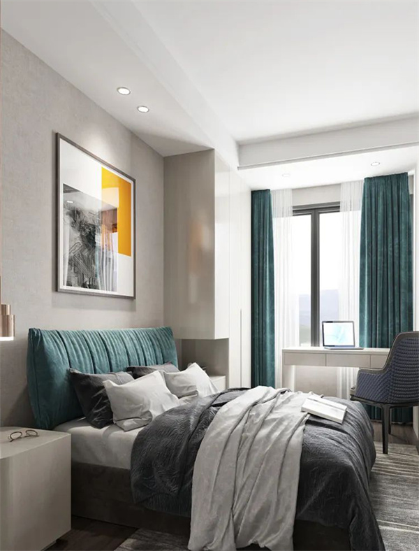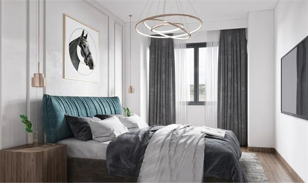 主臥室以中性色調為主,墻面白+灰組合,地板采用深色木質元素搭配灰色床品,床頭配有現代質感的收納柜,為主人提供額外的儲物空間。陽光通過大大的飄窗灑入房間,為整個空間帶來了溫暖和明亮。