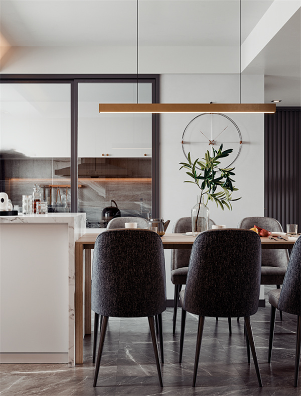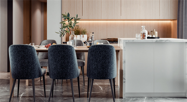 餐廳與客廳相連,采用了開放式布局這個設計充滿層次感。島臺選用與客廳電視背景同款的大理石,作為呼應的原木色餐桌搭配六把布藝餐椅,簡潔的設計,賦予餐廳簡約大氣的質感,帶來不流俗的個性格調。