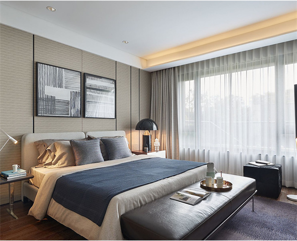 床頭兩側(cè)各配以一盞柔和的燈光,營造出私密且寧靜的閱讀空間。窗簾選用輕薄的布料,自然的光線透過窗戶灑進房間,與淺色墻面相映成趣,給人一種清新明亮的感覺。