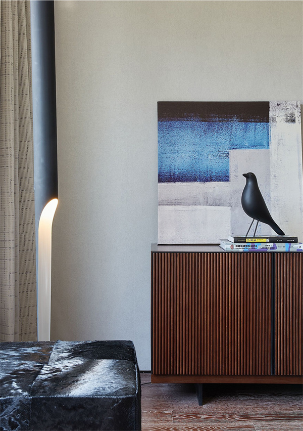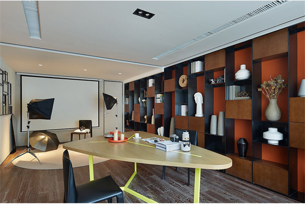走進書房,被一整排書柜所吸引,大量藝術擺件展示主人品味與藝術素養(yǎng)。加上大量使用的橙色元素,使整個空間更加充滿活力和生機,每一處細節(jié)都在呼應著整體的設計理念,既獨具特色又不失和諧統(tǒng)一。