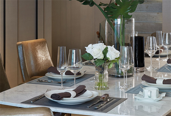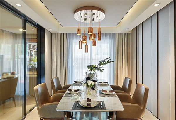 隨著空間動線進入餐廳,皮藝餐椅與亮色大理石餐桌的搭配,輕松營造出輕奢優(yōu)雅的氛圍。加上線型黃銅吊燈的運用,讓空間既有精致氣息又不失溫潤質(zhì)感。