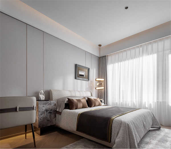 窗紗采用輕薄的布料,自然光線透過窗戶酒進房間,與墻面的色彩相融合,增添清新明亮的感覺,營造出寧靜、優雅的休息空間。