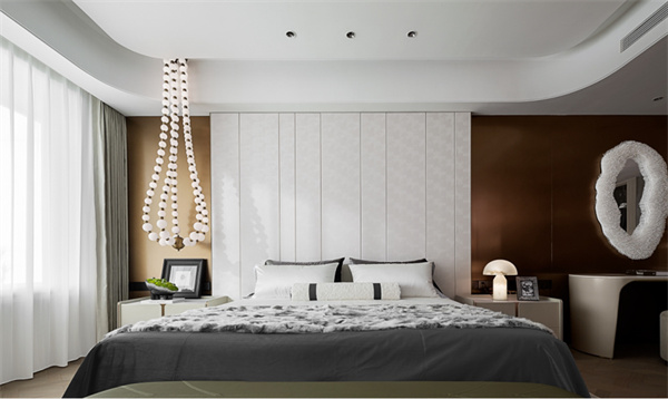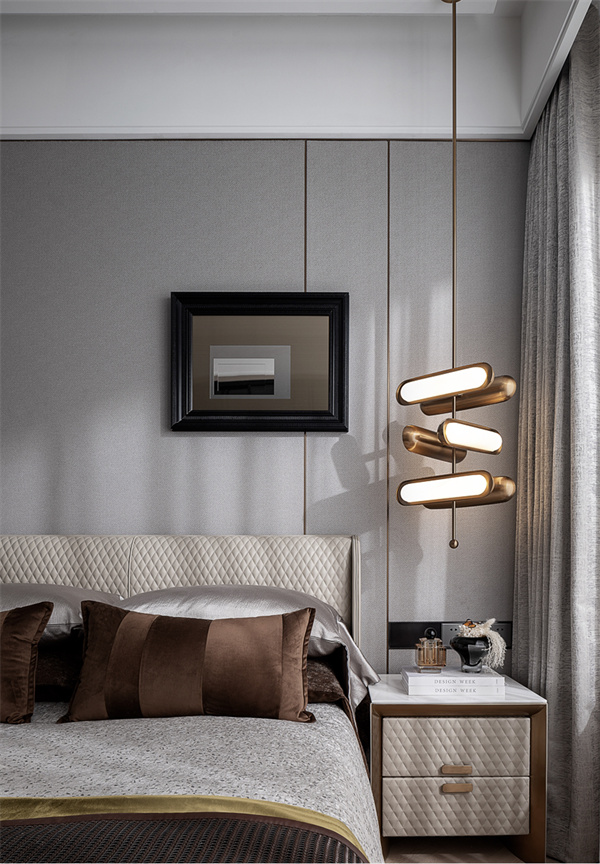 主臥空間散發著一種優雅與舒適并存的氛圍質感。柔軟的床和精致的床頭背景設計,營造出輕奢質感。床頭擺放著精美家居飾品,暖色的臺燈搭配裝飾畫,增添了空間的雅致感。