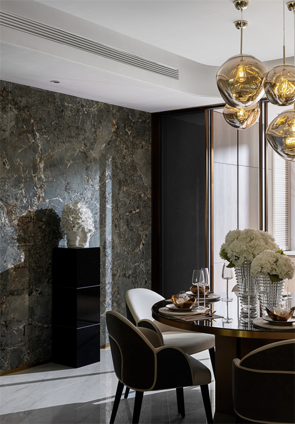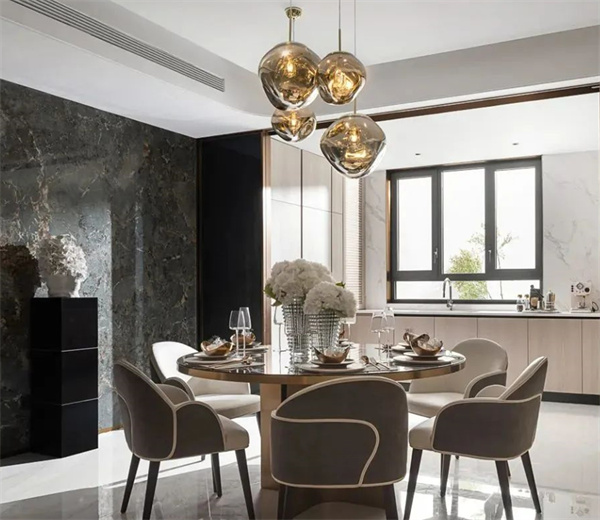 意式輕奢餐廳強調用餐空間的舒適和尊貴感,圓型餐桌和華麗的金色藝術吊燈展現出奢華的氛圍。且充分利用自然光線,讓整個空間更加開闊明亮,打造出一個與家人和朋友共享美食的完美場所。