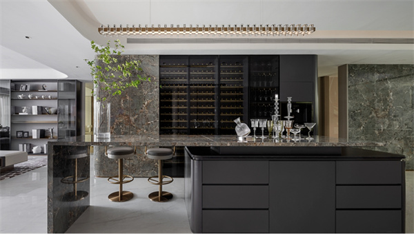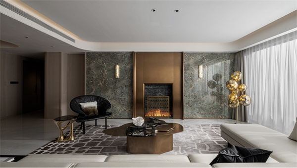 客廳以奢華和舒適為特點,注重細節和藝術品味。大理石地板和潘多拉的巖板的鏤空式墻壁飾面設計,營造出高貴的質感。軟裝設計上選用簡潔干凈的布置溫潤、素雅且低飽和度的色彩搭配,讓整個空間充滿高級的溫柔感。