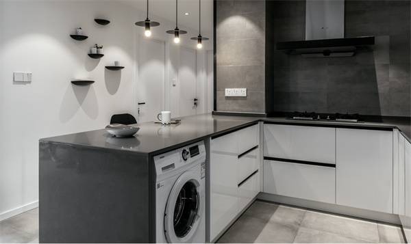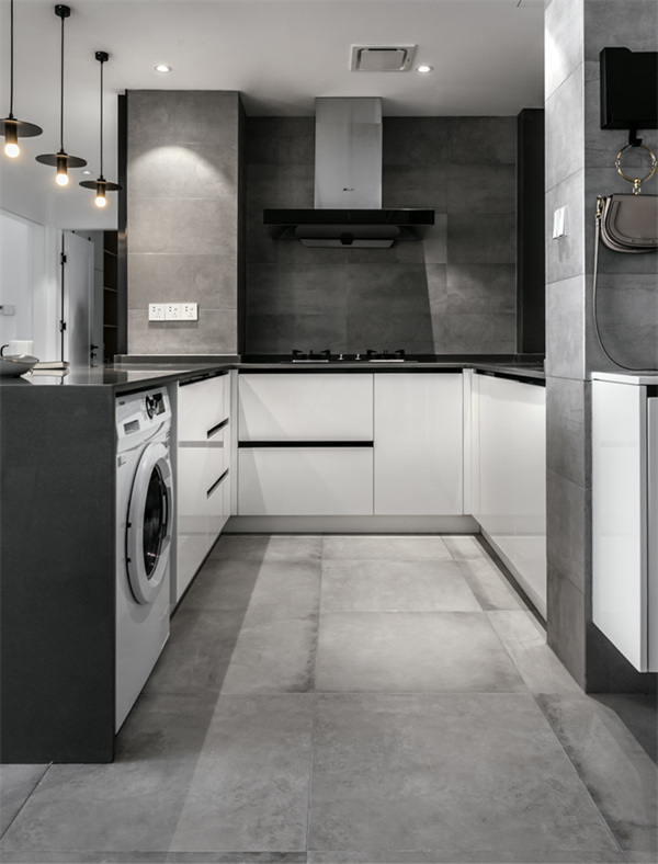 廚房采用半開放式設(shè)計(jì)的黑白灰配色方案。櫥柜則選用白色柜面和灰色臺(tái)面組合,搭配嵌入式電器,創(chuàng)造出極簡的外觀。同時(shí),灰色大理石紋路的地板與墻面,也為廚房增添了質(zhì)感。