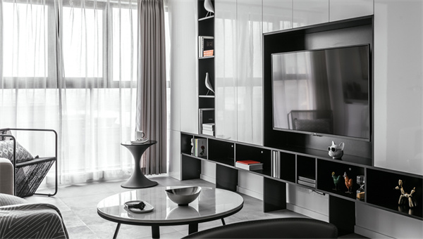 客廳墻壁和天花板都采用了純白色裝飾。設(shè)計(jì)師巧妙地運(yùn)用黑白相間的電視背景墻,增添一絲現(xiàn)代感和視覺層次感。寬大的窗戶將自然光線引入室內(nèi),中性色的大理石地板為空間增添質(zhì)感和豪華感。