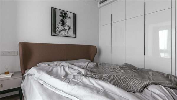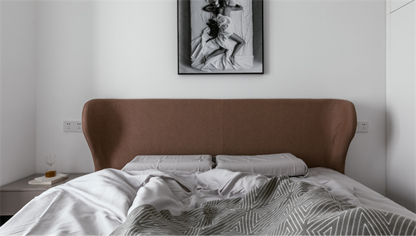 主臥以寧靜舒適為主題。房間鋪設(shè)了溫暖的原木地板,給人一種自然質(zhì)樸的感覺。床頭背景墻采用白色+灰白藝術(shù)掛畫的組合設(shè)計(jì),既顯得簡潔大氣,又增加了空間的層次感。