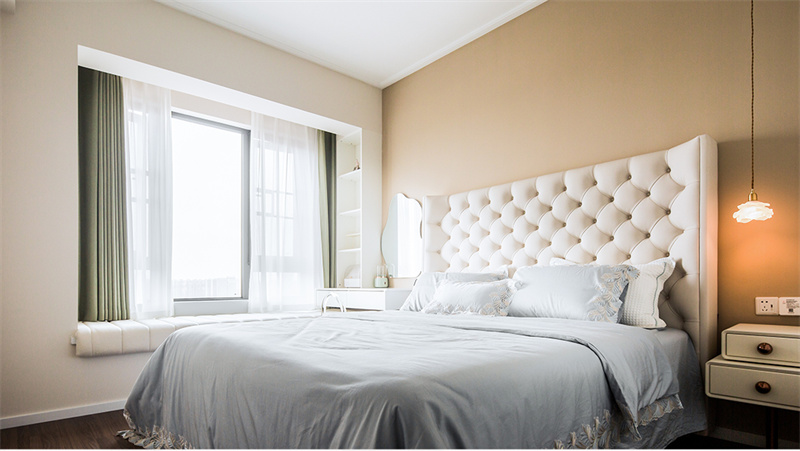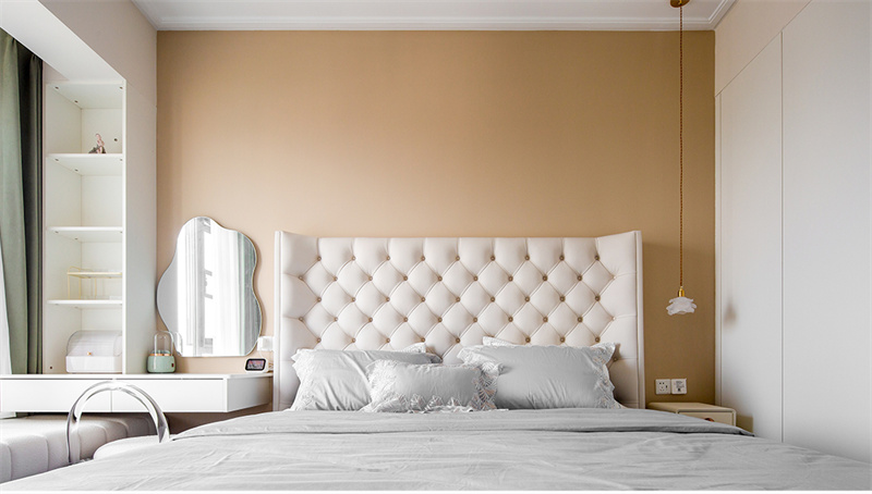 主臥墻面采用淡雅的暖色調。床頭一側的暖色藝術燈散發出柔和的光線,為臥室增添了一份溫馨感。另一側精致的梳妝柜設計,提升整體的空間美感,搭配精致的裝飾,營造出寧靜而優雅的休憩空間。