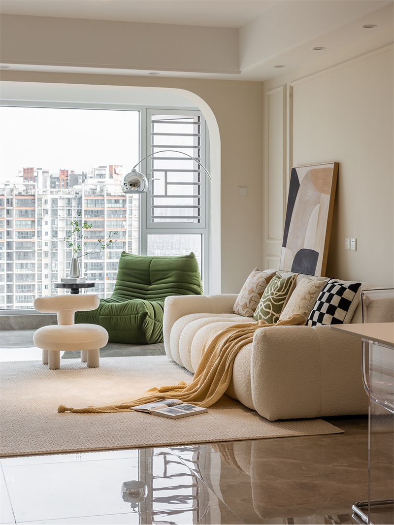 寬敞的陽臺被設計成一個放松與享受的角落。一張精致的單人沙發躺椅,配上清新綠植,無論是享用一杯下午茶,還是欣賞城市風景,都能感受到新法式風格帶來的高雅與悠然。