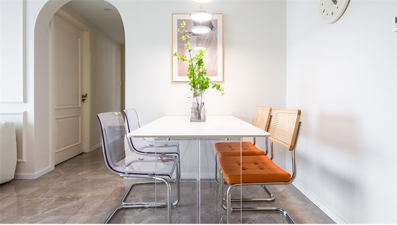 餐廳延續白色主調,餐桌上一束新鮮的花卉與柔和的色調相呼應,為用餐環境增添了一抹生機。墻面裝飾著精美的掛畫,提升了整體的奢華感,頂面使用一組溫馨燈光組合,為餐廳增添幾分浪漫的氣息。