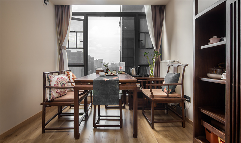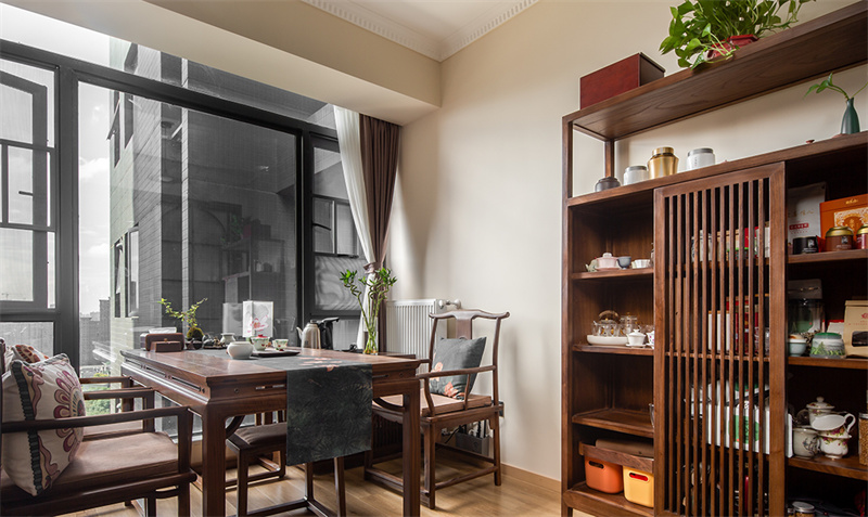書房深色木質書桌和椅子散發(fā)出濃郁的古典韻味,與淺色墻面形成鮮明對比,既莊重又不失溫馨。書架的裝飾品和綠植點綴其間,為整個空間增添了幾分生機與活力。無論是閱讀、寫作還是思考,這里都能提供一個舒適、專注的環(huán)境。