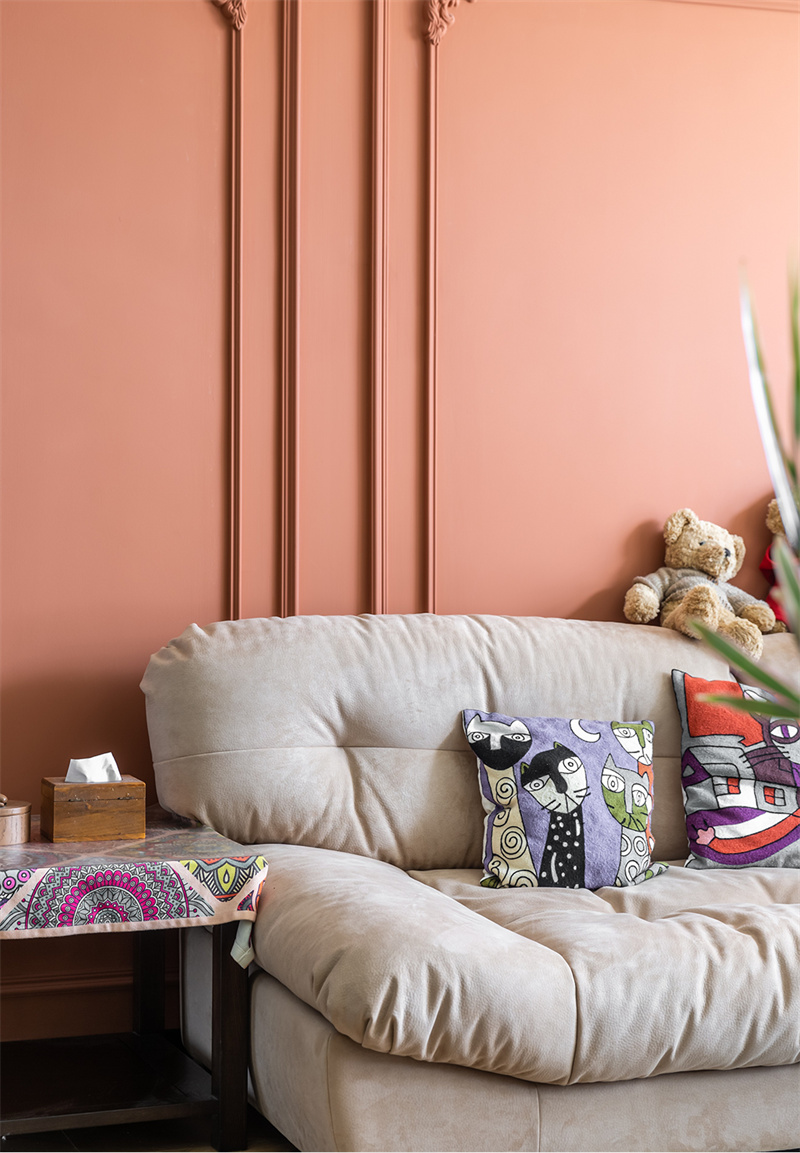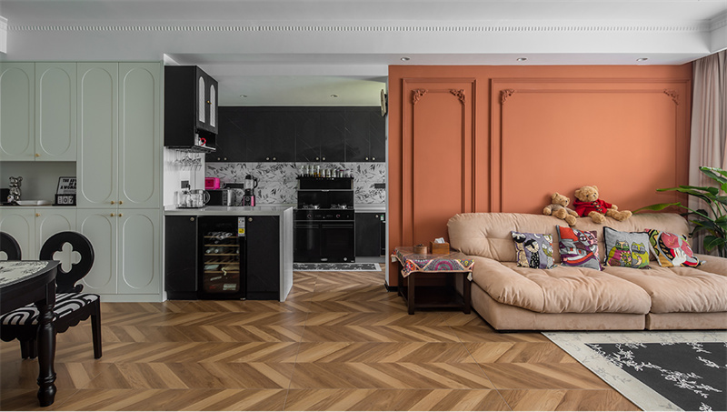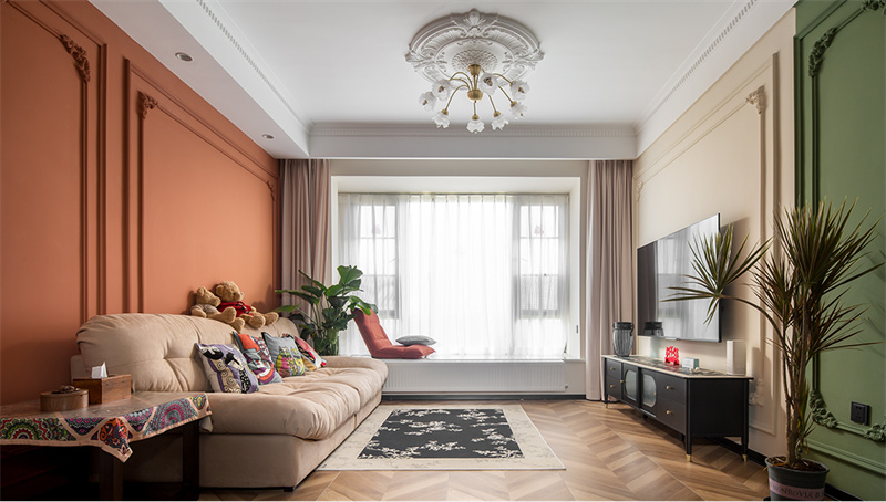 步入客廳,仿佛穿越回了浪漫優(yōu)雅的法國古典時期。溫暖的橙色墻面搭配精致的雕花裝飾,整個空間柔和又浪漫,墻面用石膏線做裝飾,打破白墻的單調空洞,增加藝術感。