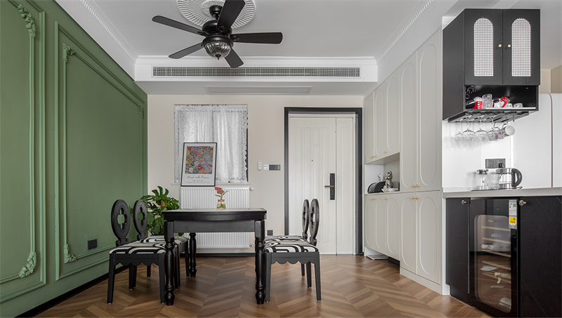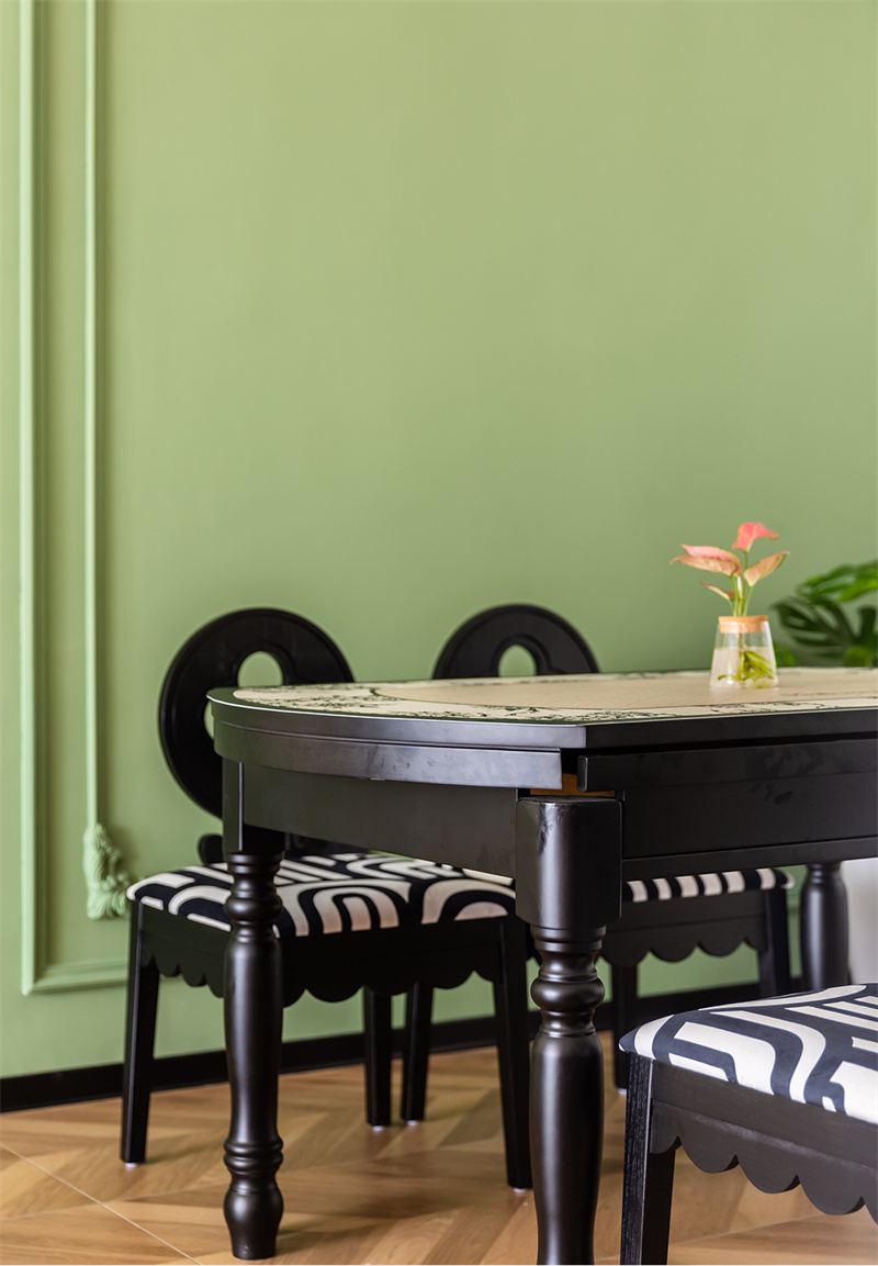 餐廳定制了整排收納柜,承擔了收納+餐邊柜功能。原木餐桌搭配復古吊燈,營造出自然溫馨的就餐環(huán)境。背景墻整面做綠色裝飾,與白墻和黑色的餐桌椅組合,彰顯出自由、靈動的美學意蘊。