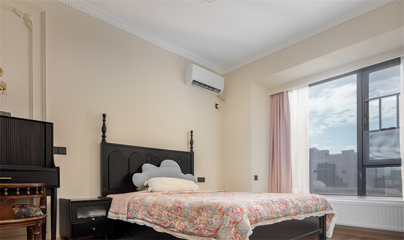 主臥延續(xù)了整體的色系搭配法則。大面積奶油色調讓整個空間看起來復古又慵懶。背景墻搭配了款式簡約的石膏線條,恰到好處地增添了精致感。黑色木質床架與色彩豐富的床上用品搭配,既經典又不失活力,讓人感受到法式風情的獨特魅力。