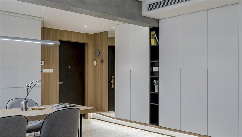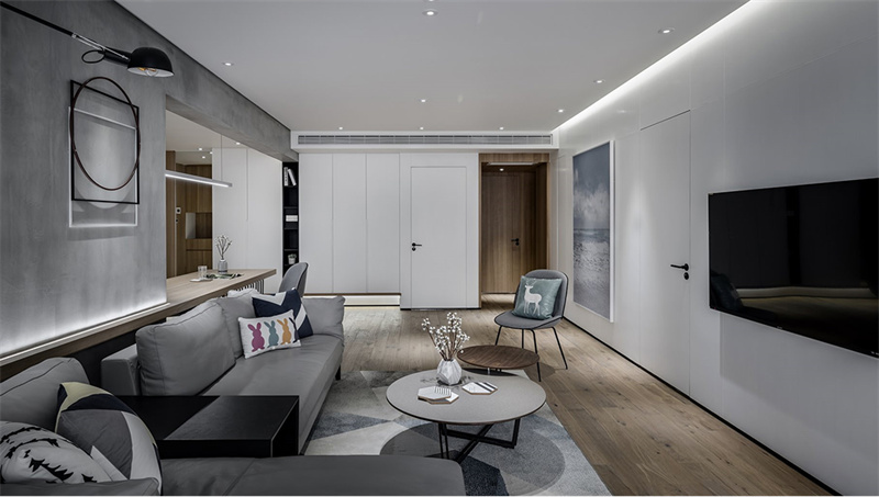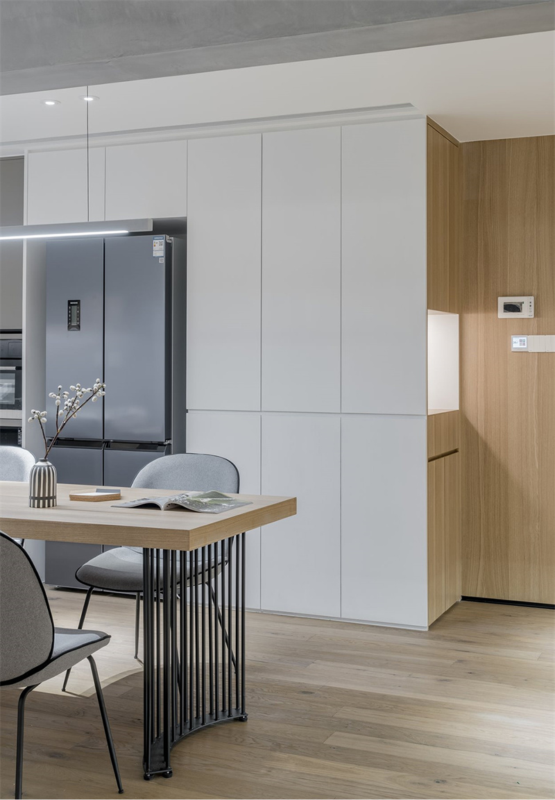 本案中,繁復的裝飾被摒棄,取而代之的是線條的簡潔與空間的流暢。以原木地板、家具搭配白色墻面,不僅營造出一種寧靜舒適的氛圍,更彰顯了生活的品質與品味,讓每一個居住空間都充滿了現代感與高級感。