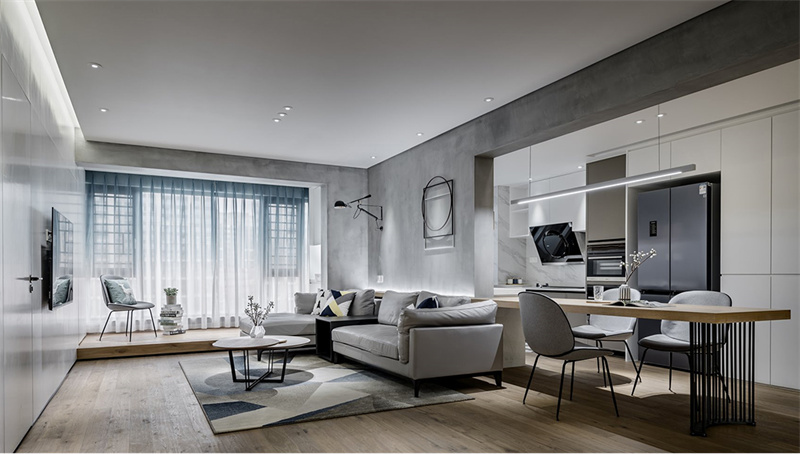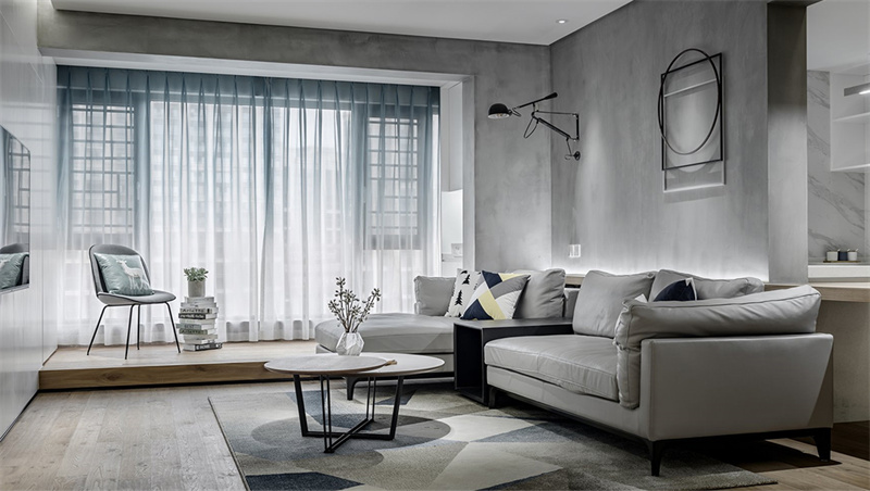 客廳空間灰色水泥墻面與木質地板的巧妙搭配,營造出一種自然而又不失時尚的氛圍。寬敞的落地窗設計讓充足的自然光線灑滿整個房間,透過輕盈的藍色窗簾,帶來明亮而通透的視覺享受。