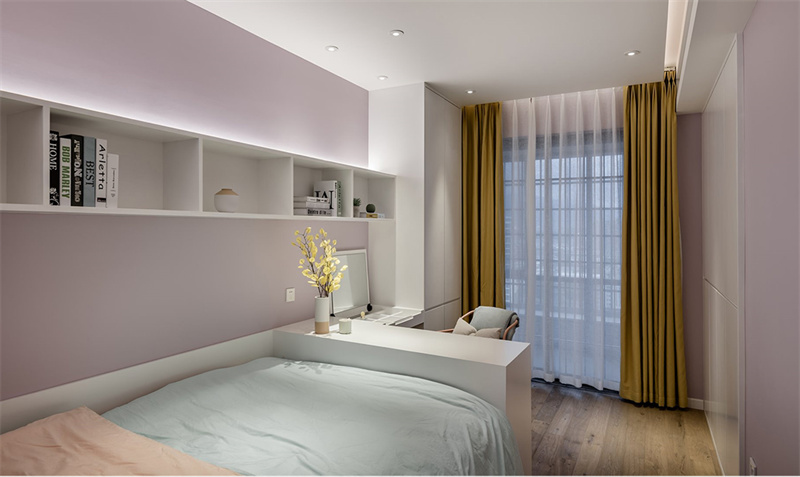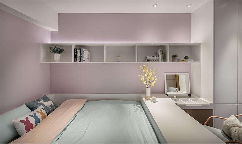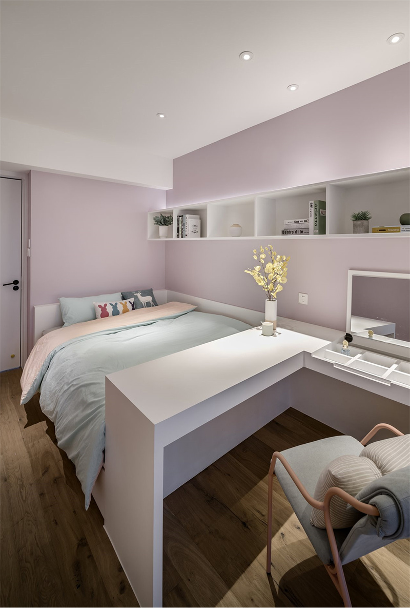 兒童房采用粉色+白色組合做主導色調。房間一角設計了L型書桌和椅子,既節省空間又功能齊全,為孩子提供了理想的作業和學習區域。書桌上擺放著裝飾品和書籍,體現了主人對細節的關注與品味的追求。