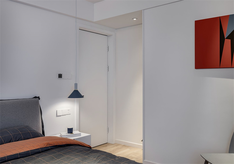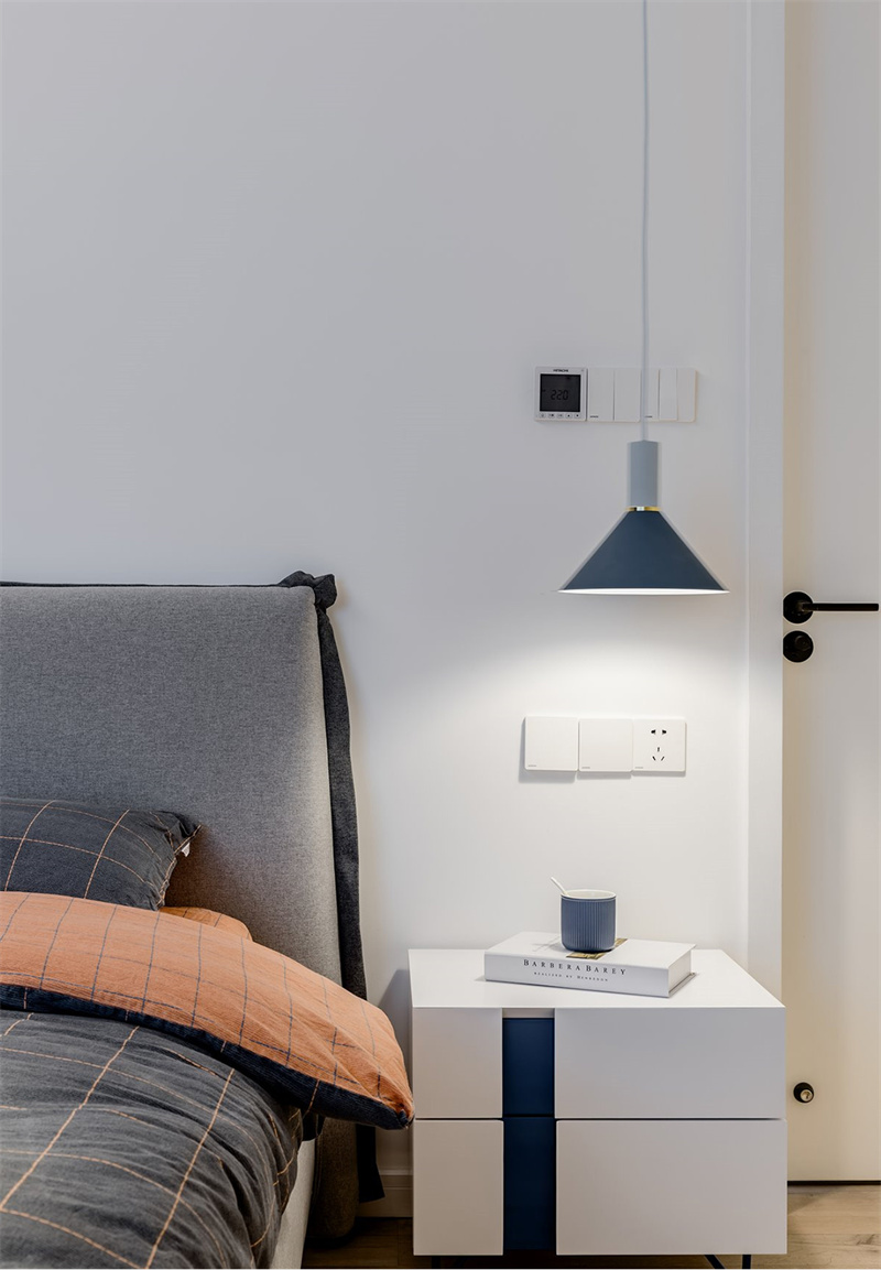 臥室的墻面選擇明亮的白色,增加空間感和提升明亮度。地面采用原木色木質地板,為空間增添溫暖和自然感。墻上的智能溫控面板和開關設計,展現了現代科技與生活的完美結合,提升了居住的便捷性和舒適度。