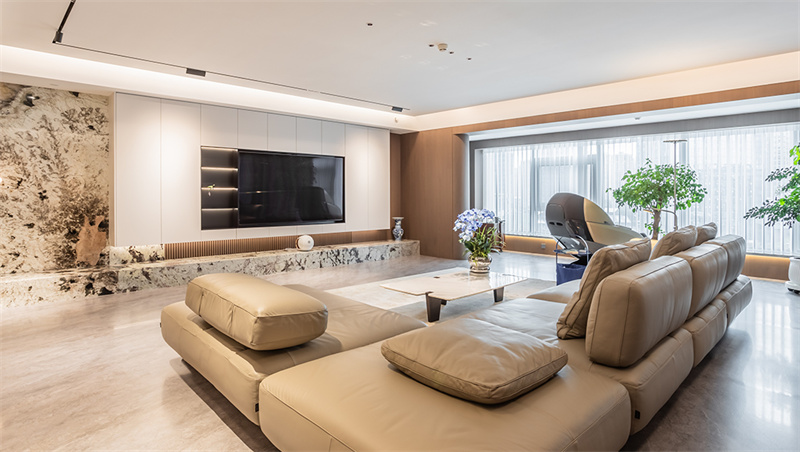 意式輕奢客廳以豪華和舒適為特點,注重細節和藝術品味。寬敞的空間設計與精致的細節處理,共同營造出一種高貴而不失溫馨的氛圍。米色真皮沙發搭配柔軟的靠墊,散發出濃郁的舒適感與奢華氣息,讓人一踏入便感受到家的溫暖與愜意。