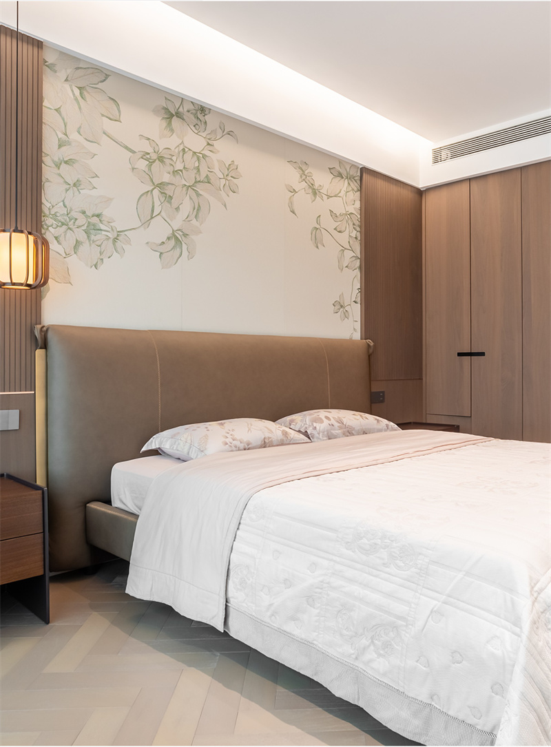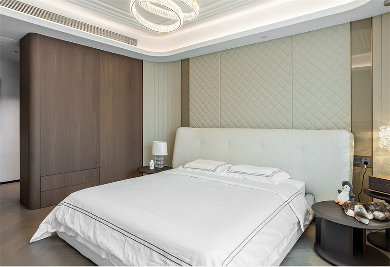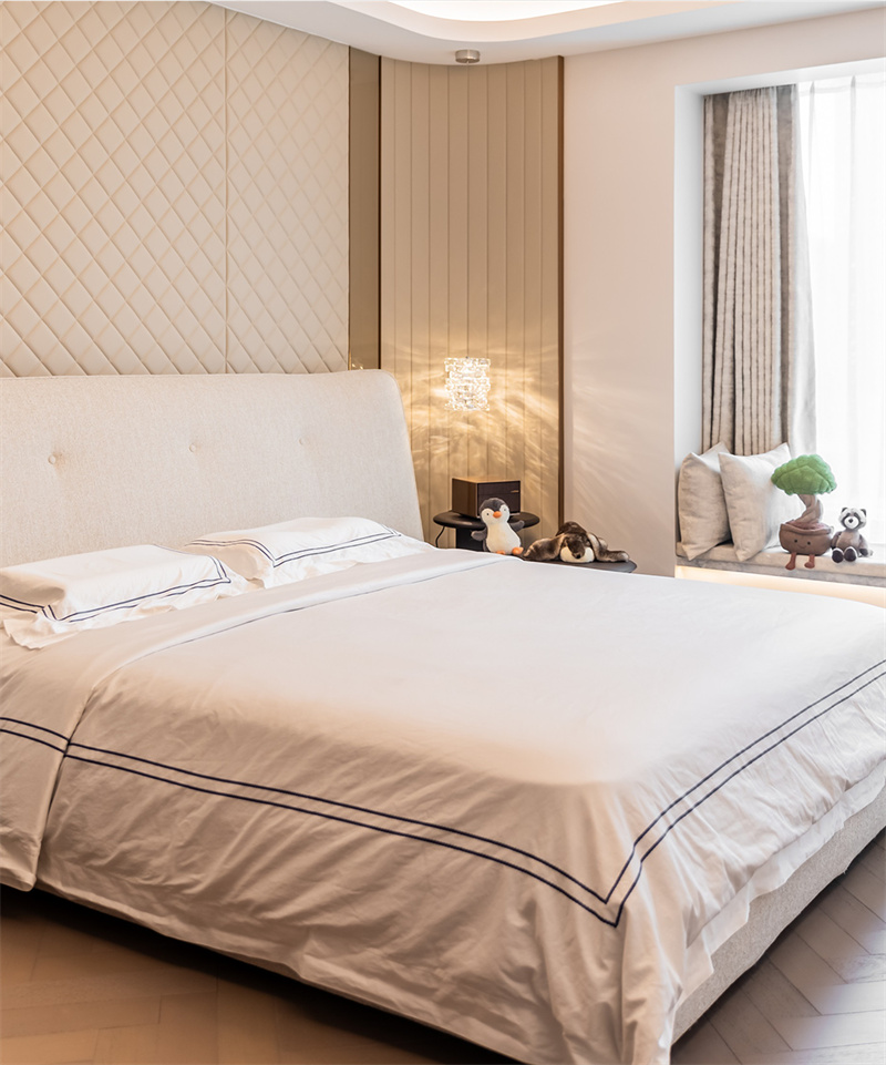 臥室的設計上用了簡約的線條為核心元素,搭配絲綢質地的床品和柔和的色彩。柔和的色調與精致的裝飾細節完美融合,營造出一種高貴而不失溫馨的氛圍,讓人在繁忙的生活中找到一片屬于自己的寧靜空間。
