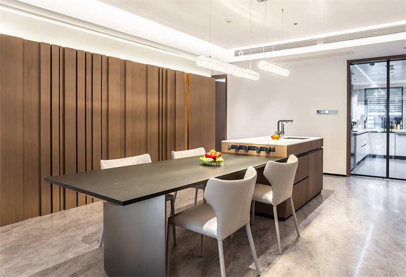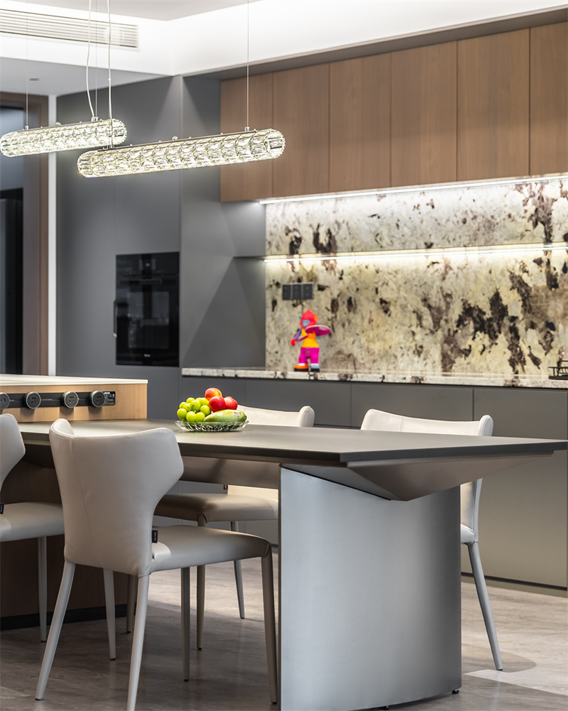 大理石餐桌搭配白色皮質餐椅,線條流暢、造型簡約,展現出意式設計的獨特魅力。背景墻采用豎條紋木質裝飾板,不僅提升了空間的層次感,還帶來了一種自然的溫暖感。懸掛的水晶吊燈設計簡約而不失奢華,為用餐時光增添了幾分浪漫與溫馨。