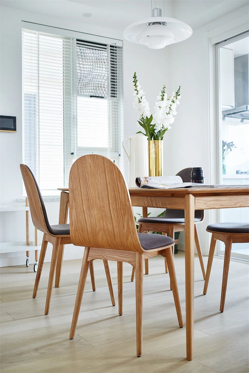 客餐廳整體以白色和原木色為主,搭配同色系的家具顯得一致協調,配合暖色燈光,分外溫馨,墻上的掛飾加上餐桌上的花卉,每一處細節都經過精心布置,充滿了儀式感。
