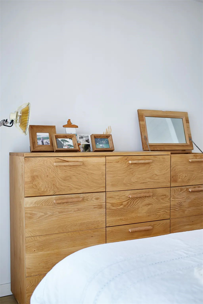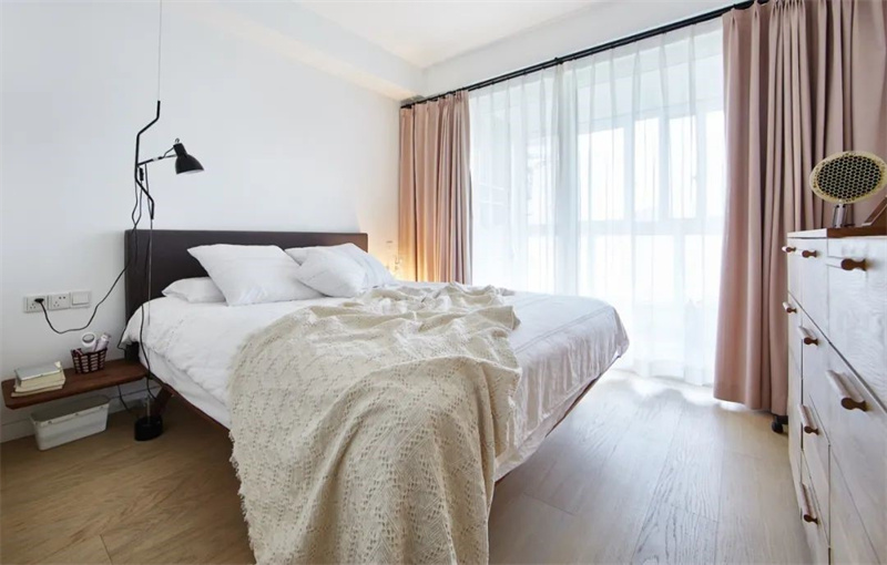 主臥的大飄窗讓人心動,陽光灑入、微風幾許一片歲月靜好,暖色床品、軟裝掛飾搭配,營造出寧靜淡雅的睡眠環境。整體色調偏暖,簡約溫暖舒適,床頭的小臺燈在夜晚照亮屬于自己的小天地。