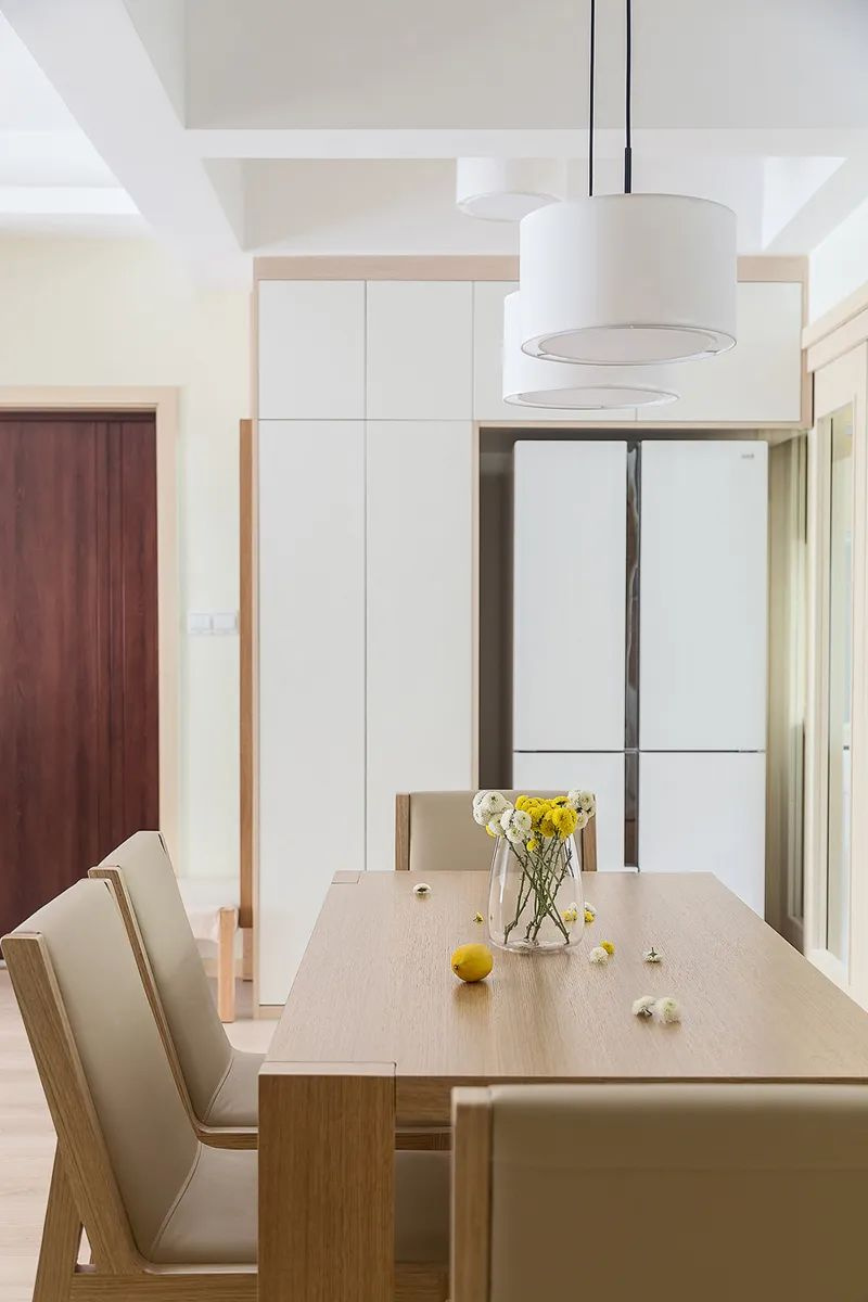 原木風格的餐桌與米色軟墊椅完美結合,背景中的白色柜體和冰箱設計簡潔大方,與整體色調和諧統一,使餐廳顯得更加寬敞明亮。桌上的花瓶中插著幾束黃色小花,搭配一個檸檬點綴其間,不僅提升了視覺美感,還帶來一絲清新與活力。