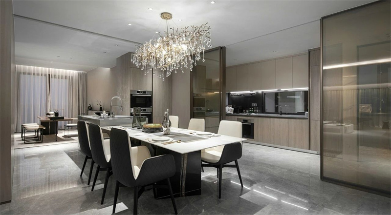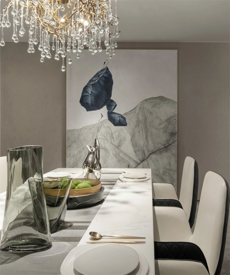 意式輕奢餐廳強(qiáng)調(diào)用餐空間的舒適和尊貴感。開放式的設(shè)計(jì)讓光線在餐廳與客廳間自由流動(dòng),整個(gè)空間視野明亮而通透,完美呈現(xiàn)了意式輕奢的優(yōu)雅格調(diào)與舒適居家體驗(yàn)。